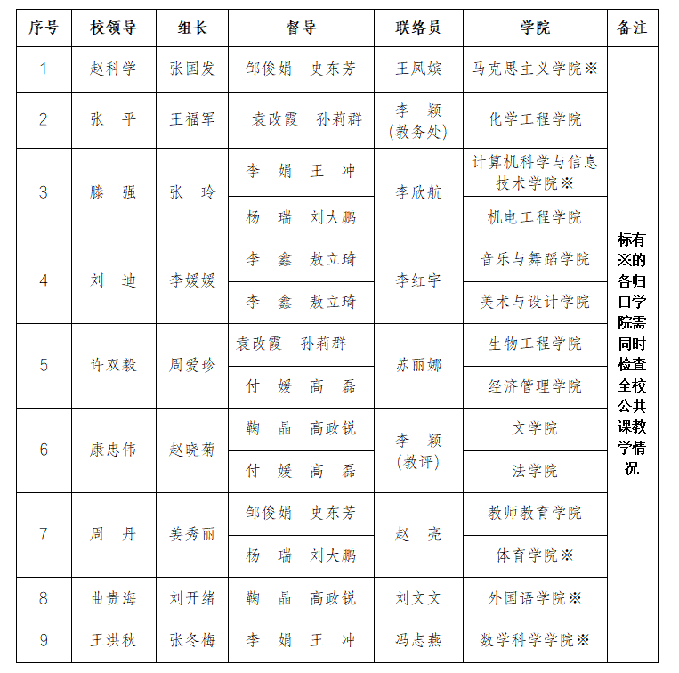 为做好新学期开学准备及教学运行工作。在第一至第三教学周(9月1日至9月21日),由校领导带队,组成9个专项检查组,对各教学单位开展教学检查工作,各组组长负责协调推进本组开展工作。具体安排如下: