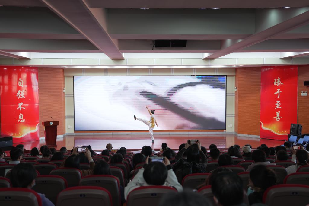 成果展示环节中师生同台,尽显教学相长的蓬勃生机。学生学习成果展示中,体育学院学生李昕的《长拳表演》,将力与美完美融合,展现了体育师范生扎实的专业技能;文学院学生王璐鑫以《从“行知杯”到“田家炳杯”:我的教学技能提升之路》为题,诠释了“以赛促练、以赛促教”的育人实效;教师教育学院李珍盈、外国语学院张钰莹和法学院李世民三位学生联袂演绎的英语短剧《我的夺冠之路》,展现了学生英语应用能力和国际化素养。