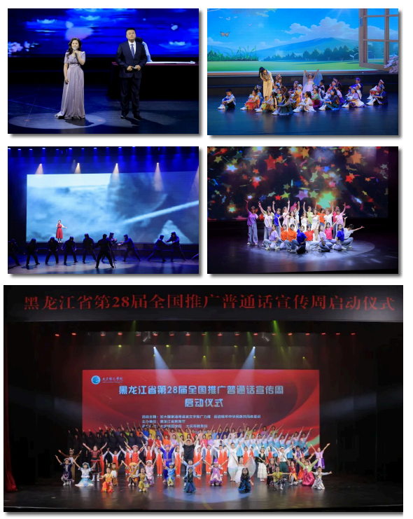 启动仪式上,来自我校和大庆市中小学幼儿园的师生展示了精彩的语言文化艺术节目,用歌声、诵读声抒发了爱国情怀。大庆市幼教中心情景剧《童声诵经典 诗韵润童心》,让观众跟随孩子们纯净的童声,穿越时空长廊,触摸中华文化的基因密码。大庆师范学院女子群舞《薪火•花开处》,是一曲对教育初心、理想承继的深情颂歌,展示了关于责任、热爱与永恒传承的动人礼赞。大庆师范学院经典诵读《春江花月夜》,以普通话连接古今,以笔墨为舟、以声韵为桨,将书法作品与古典乐器同时呈现,体现了文化传承的创新表达。启动仪式在大庆市庆风小学课本剧《多彩童心 团结一家》的精彩表演中落下帷幕。